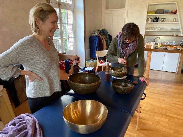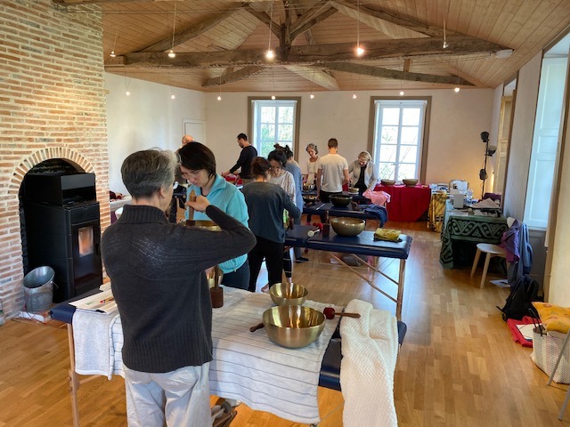 Apprentissage du massage sonore avec les bols chantants. Vous apprendrez à choisir vos bols, à ressentir leur vibration. Vous découvrirez comment poser vos bols sur des zones spécifiques du corps pour apporter un soulagement et un profond bien-être. Plus de 50 bols seront mis à votre disposition pour ce stage.