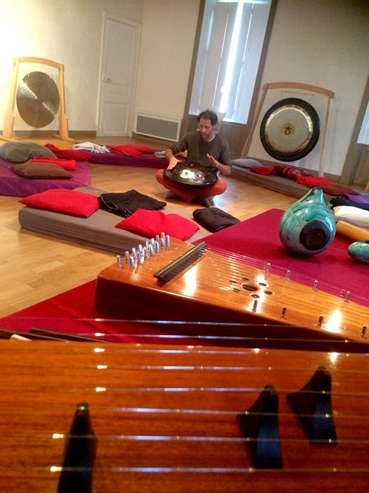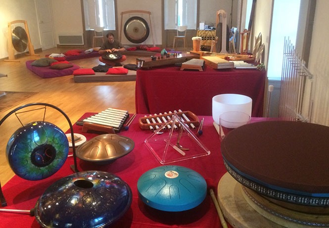 tambours et flûtes amérindiennes, carillons, flûtes harmoniques, monocorde, gongs, songpods, cloches tubulaires, handpan, Kigonki, tamboa, RavDrum, Zenko, sansula, rhombe, hochets, métallophone, ocarina, xylophone, pyramide de cristal…
