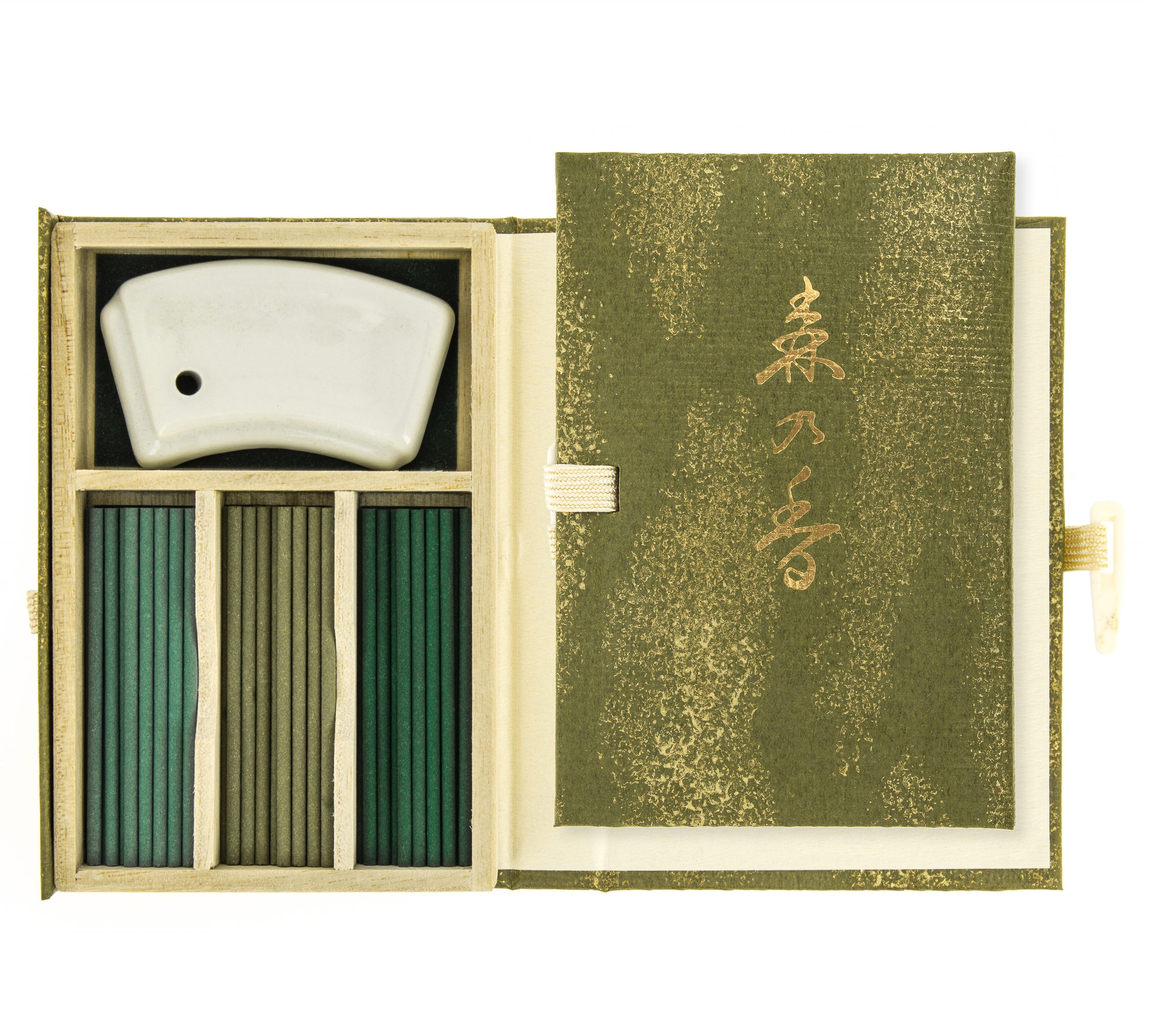 Trois senteurs boisées: pin, cyprès japonais hinoki et cèdre. La boîte en bois de paulownia préserve l’encens de l’humidité.