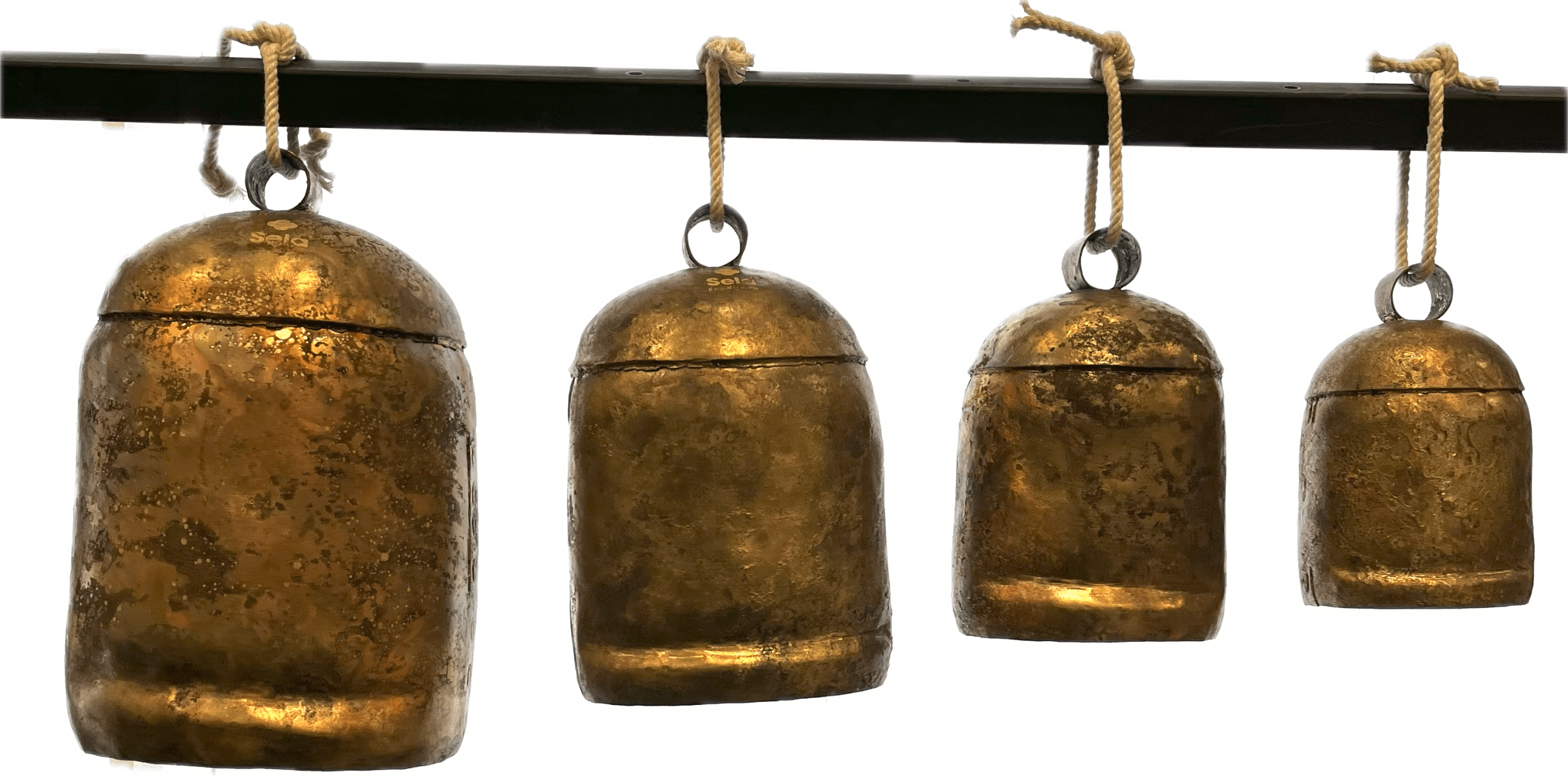 Elles sont faites de feuilles de fer et trempées au laiton, leur son est unique, imparfait et envoûtant. Leur timbre rappellent les cloches d’alpages mais avec cette touche d’exotisme amenée par le martelage manuel du laiton.